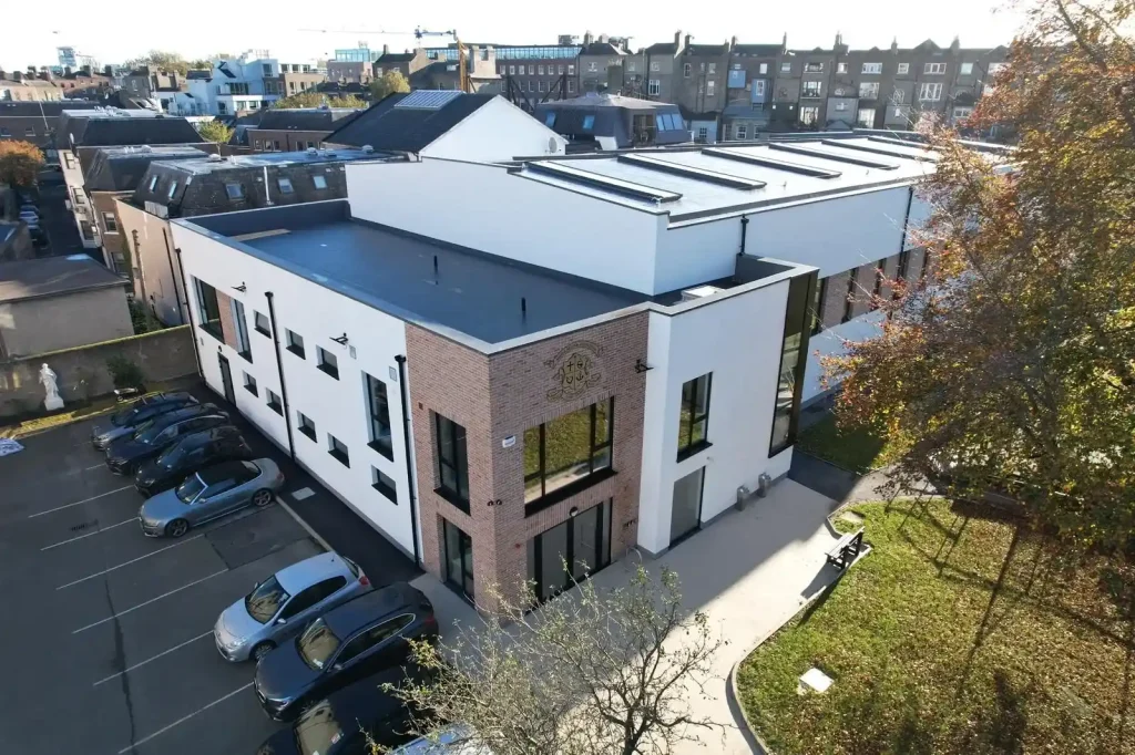 A full mechanical services upgrade was performed at Loreto College, St Stephens Green. Works included removal of outdated systems and installation of new energy- efficient heating, cooling, and ventilation infrastructure. The project featured external heat pumps, radiant panels, new LPHW systems, and upgraded HRU ventilation for changing and toilet areas. New copper water and waste pipework was installed throughout, with automated CO₂-controlled high-level windows in the sports hall and a new plantroom incorporating pumps, manifolds, and a Building Management System for efficient operation and long-term reliability.